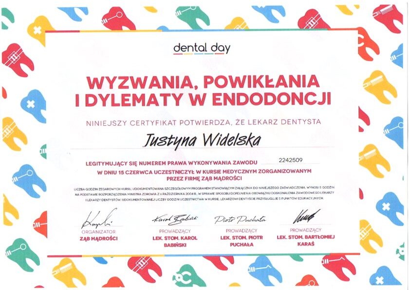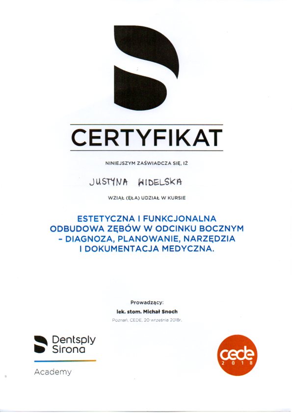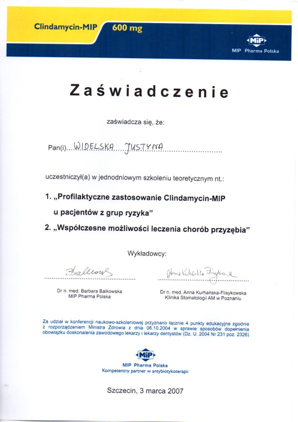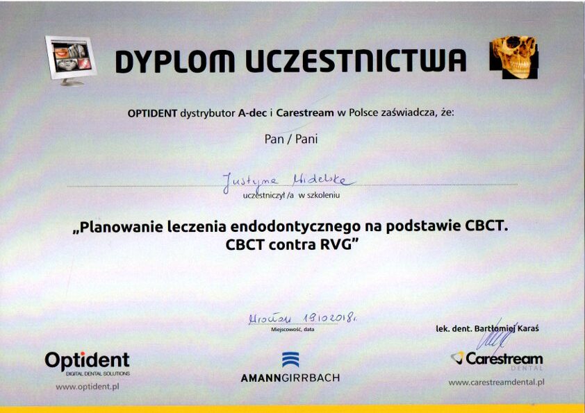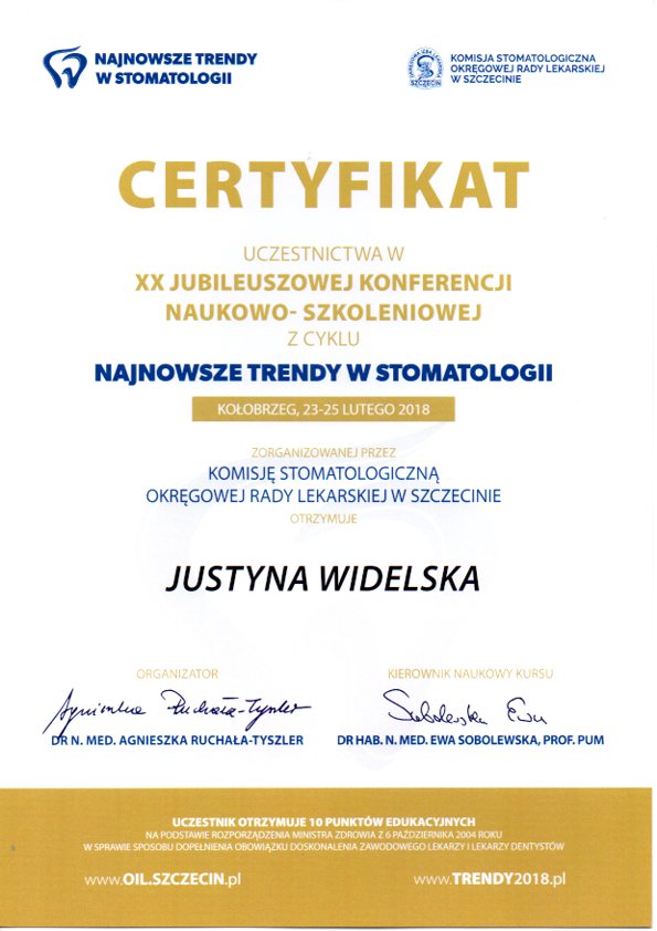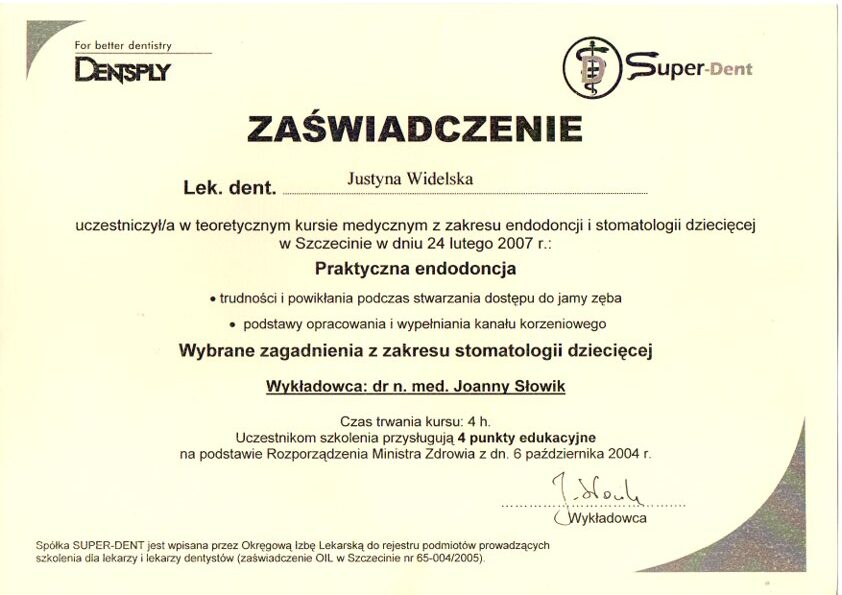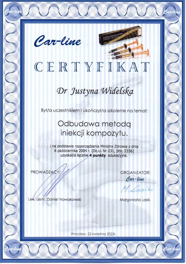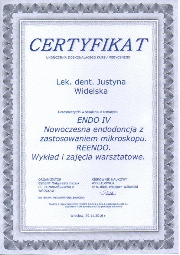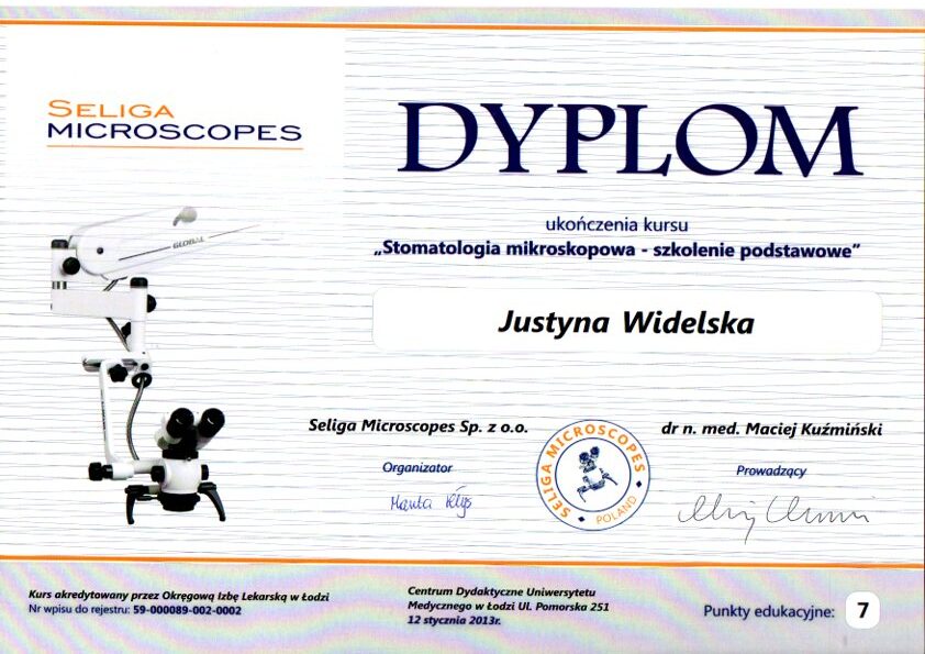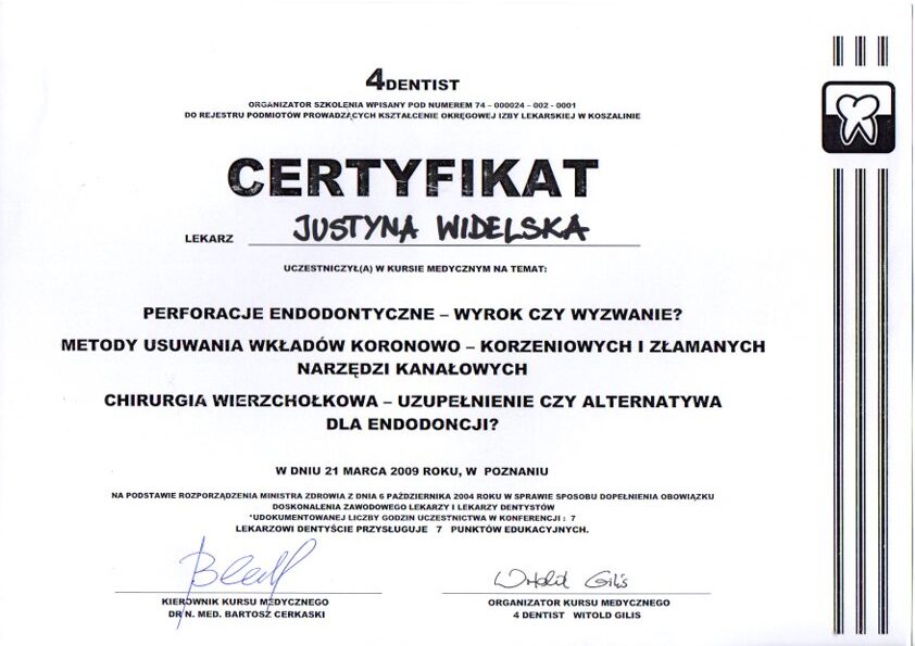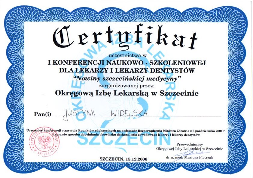 Ukończyłam studia na Wydziale Stomatologii Pomorskiej Akademii Medycznej w Szczecinie w 2006 roku. Moją pasją zawodową jest stomatologia mikroskopowa, endodoncja i protetyka. Głównym obszarem moich zainteresowań jest protetyka z wykorzystaniem skanera wewnątrzustnego oraz estetyczne odbudowy zębów w odcinku przednim. W pracy z pacjentem najbardziej cenię sobie dokładność oraz komfort pacjenta. Swoje umiejętności systematycznie poszerzam biorąc udział w licznych sympozjach naukowych i kursach praktycznych.